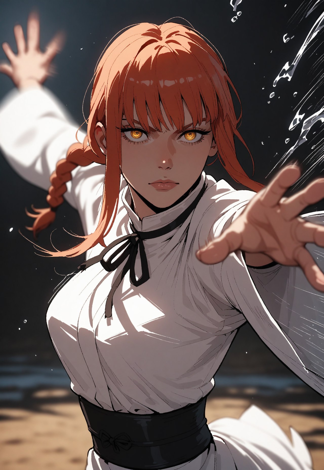 score_9, score_8_up, score_7_up, source_anime, source_explicit,,flat colors, flat illustration, lineart, highly detailed, ultra detailed, masterpiece, best quality, amazing quality, makima \(chainsaw man\), 1girl, red hair, blurry, blurry background, yellow eyes, closed mouth, depth of field, punching, punch forward, fight stand, high collar, motion blur, motion lines,, large breasts, looking at viewer, obi, outstretched hand, sash, serious, sidelocks, solo, upper body, water, wide sleeves,