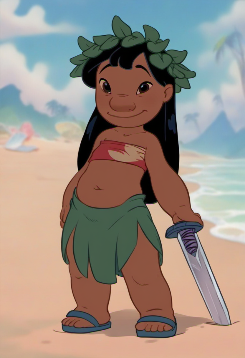 rating_explicit, <lora:Lilo_Pelekai_for_PonyXL:1>, lilo_pelekai, 1girl, solo, sandals, smile, full body, green skirt, tube top, leaf crown, holding a sword, standing, standing on the beach, looking at viewer, score_9, score_8_up, score_7_up, score_6_up, score_5_up, score_4_up