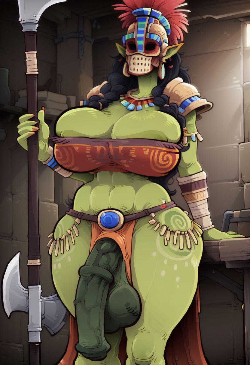 score_9, score_8_up, score_7_up, score_6_up, orc futanari, green skin, red eyes, muscles, scarred body, huge breasts, wide ass, huge hips, sharp yellow teeth, pointy ears, earrings, jewelry, face covered by bronze wolf mask, bronze helmet, wearing aztec robes, wearing furred loincloth, flaccid hyper green horsecock, thick cock, long cock, hyper sagging balls, axe on shoulder, in tavern, shadows, high detail, dark lighting, closeup, sparrow style