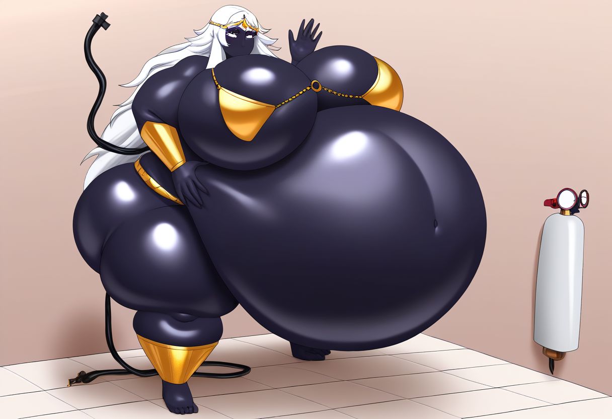 Bathroom, gigantic belly, hands on belly, hose leading into butt from air pump on ground, huge Belly press on mirror, 1girl, colored skin, black skin, circlet, facial mark, white hair, long hair, white hair, circlet, purple pelvis curtain, gold belt, neck ring, bracer, large breasts, purple eyes, no mouth, hand on hip, hand up, thick thighs, <lora:queentyranime-40:1>, queentyr, golden bra