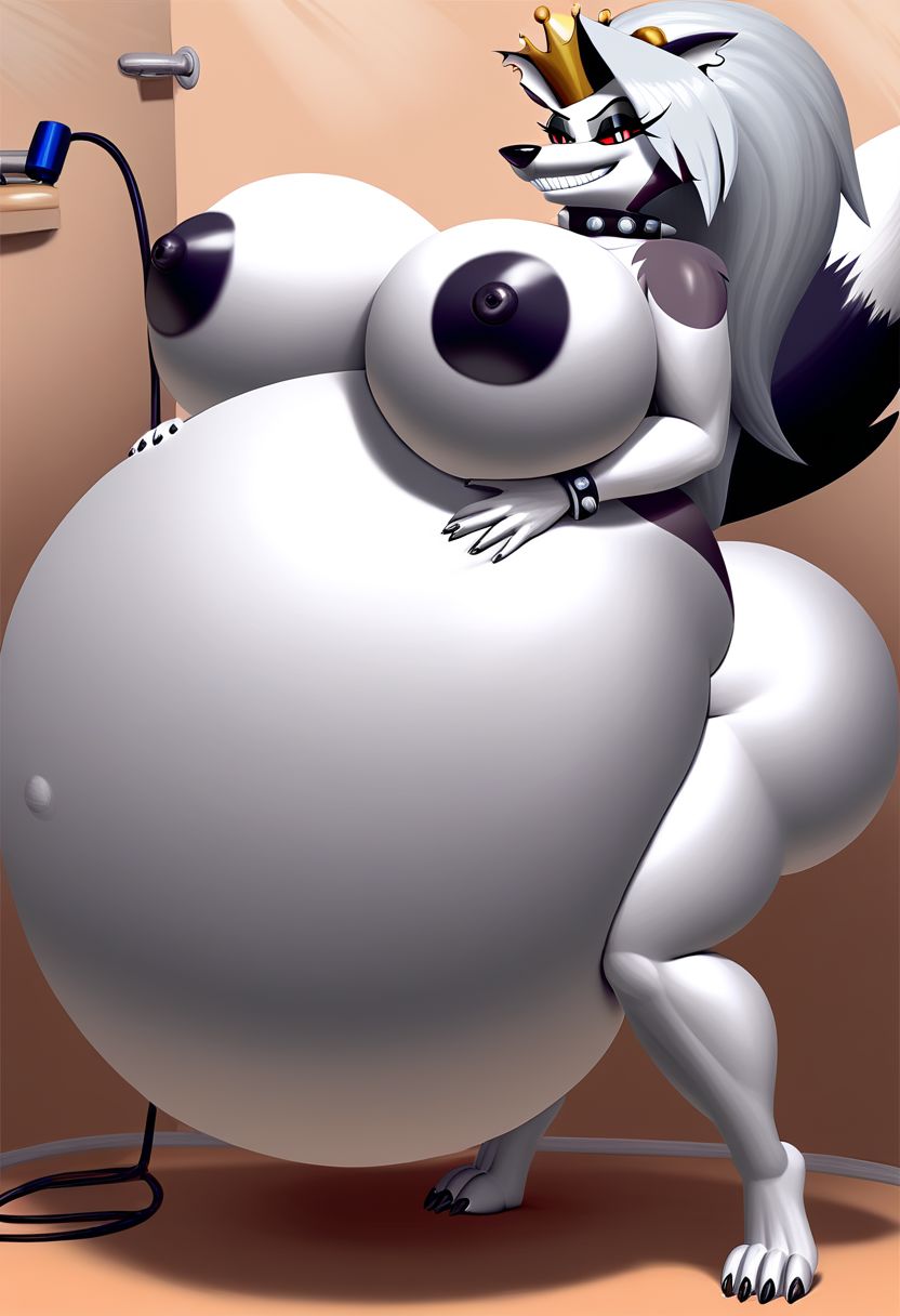 Bathroom, gigantic belly, hands on belly, hose leading into butt from air pump on ground, huge Belly press on mirror, Loona from Helluva Boss, <lyco:MegaMilkV1-20:1.0>, poseMega, 1girl, breasts, super crown, collar, large breasts, bracelet, crown, ponytail, long hair, smile, jewelry, teeth, nail polish, grin, leaning_forward, shirtMega, poseMega, hellhound, loonashorts, loonacroptop