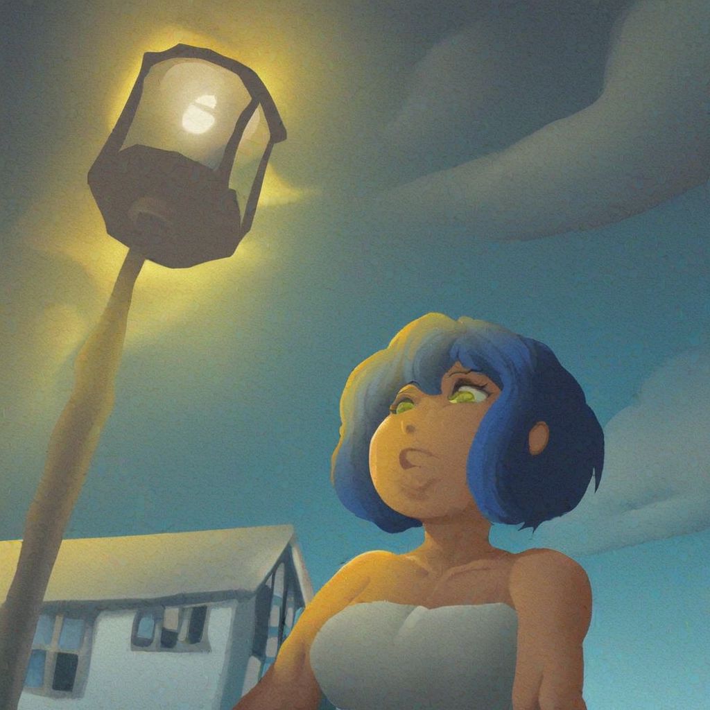 1girl, bare shoulders, blue hair,daytime scene features a blue sky above a calm ocean, juxtaposed with a nighttime landscape illuminated by a streetlamp. It explores the coexistence of day and night,