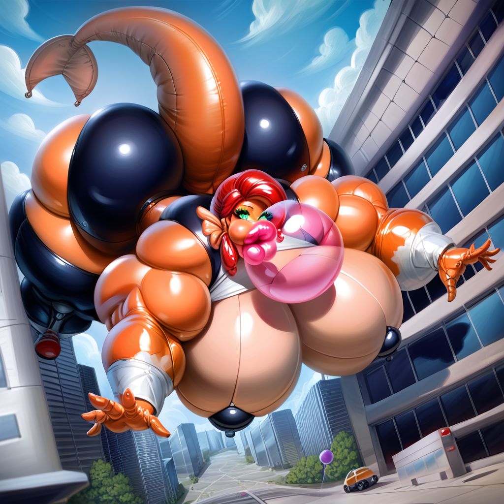 score_9, score_8_up, score_7_up, score_6_up, score_5_up, score_4_up, (((top down view))), living inflatable, big lips, (enormous lips:1.3), Jordan Carver, giantess, a beautiful woman floating in outer space in a nebula, (green and onyx see-through scale mail dress), luminescent eyes, large elfin ears, big thick long red hair, hands on face, sensual, in space, surrounded by futuristic 1980's video game space station, ultra realistic, (high quality, detailed, beautiful), detailed beautiful eyes, realistic, outstanding, (blowing massive enormous bubblegum bubble:1.3), (random tiny inflatable woman trapped inside her bubble), nipple nozzle, navel nozzle, extended hose in butt attached to planetoid, extended hose in upper arms, extended hose in nipples, breast expansion, (arm muscles nozzles), busy road with heavy traffic and people underneath her, (bigger than buildings:1.5), head up, crushed buildings, floating high in the air, selfie, user interface, fake screenshot, viewfinder, phone screen, taking picture, (hyper muscle:1.9)