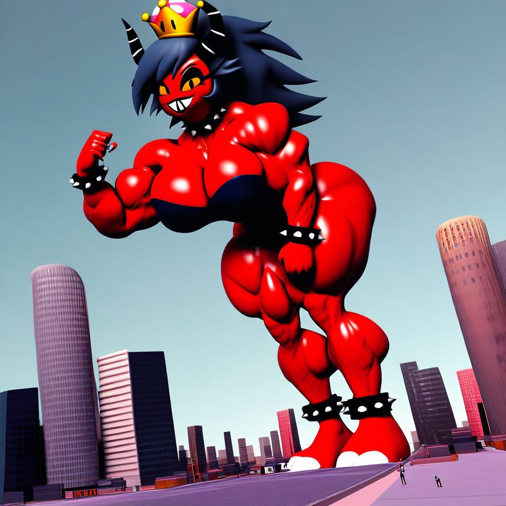 Millie from Helluva Boss, red body,, <lyco:MegaMilkV1-20:1.0>, poseMega, 1girl, breasts, super crown, collar, spiked collar, spiked bracelet, spikes, horns, large breasts, bracelet, crown, ponytail, long hair, smile, jewelry, teeth, nail polish, grin, leaning_forward, (thick thighs:1.3), (wide hips:1.4), (large boobs:1.3), big muscle,large muscle,hyper muscle,huge muscle,thick limbs,thick thighs,thick arms, full body, monster muscles, giantess, (macrogts stomping on a city:1.3), crushed buildings, (she is larger than the entire city:1.3)