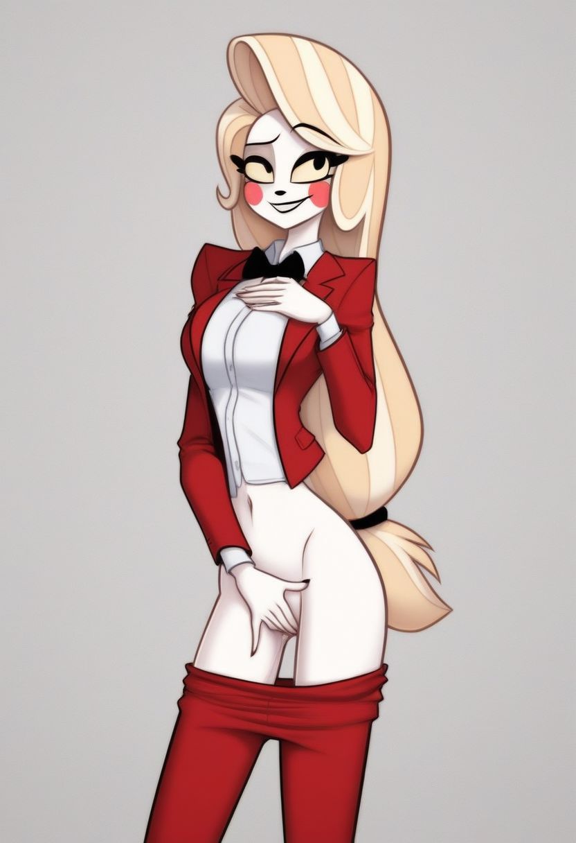 (((Charlie Morningstar))), Hazbin Hotel, 1 girl, solo, sexy, giant smile, white skin, tall and skinny, red suit with black bowtie, pants pulled down, masturbating, HazbinStyle, cartoon character, hellscape background