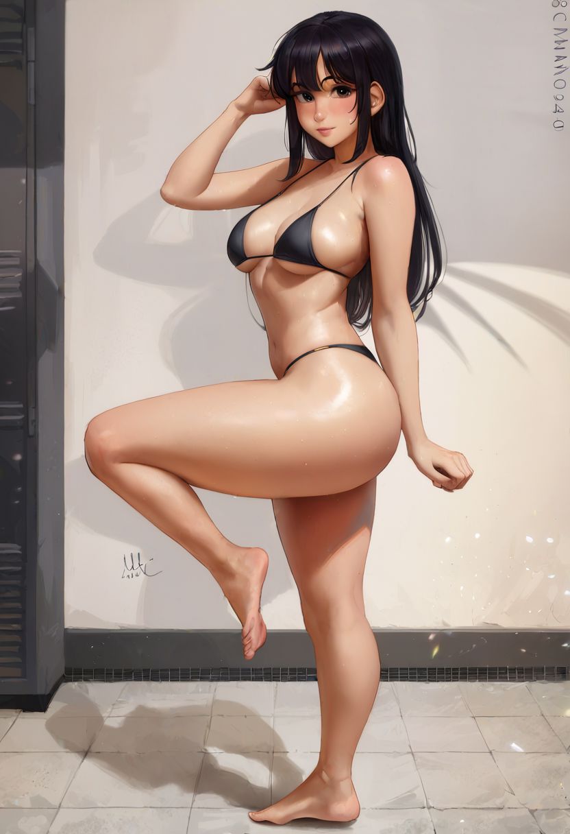 score_9, , 1girl sweaty , black hair , chibbi body ,cute face ,big boobs ,boobs press in nude sexy ,full body , one leg up , in bikini