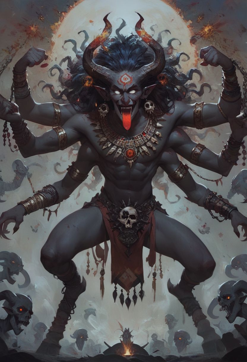 score_9, score_8_up, score_7_up, Hindu Goddess Kali with (red tongue out:1.3), holding several skulls and a sword, (riding on a demon bull with breath of fire:1.3), radiating their awesome godlike might, big eyes, dark grey-black skin, white eyes, golden jewelry, several arms, inhumanly thin, kaleidoscopic swirl of stars and nebulae in the background