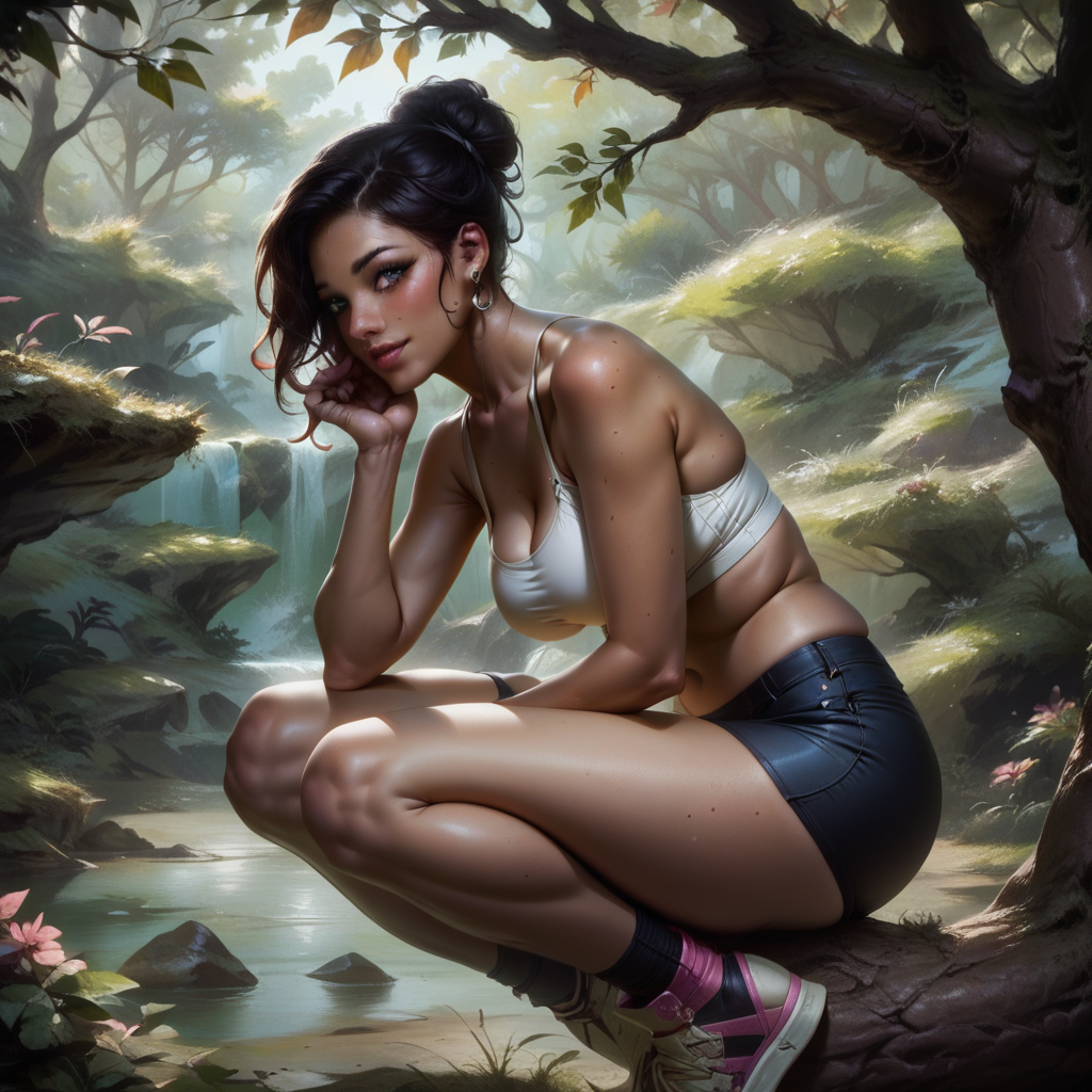 score_9, score_8_up, score_7_up, score_6_up,1girl,black leggings,white top, ebony, brown skin, tanned skin,run on path in the european forest,realistic landscape,sun tan lines,long hair in a bun,in sneakers,fullbody,curvy body,beautiful face,perfect face,detailed face,beautiful makeup<lora:add-detail-xl:1> <lora:Concept Art Twilight Style SDXL_LoRA_Pony Diffusion V6 XL:1> <lora:2.5DRealistic:1>,<lora:egirlmakeup:0.8>,egirlmakeup,side view,sitting on tree branch