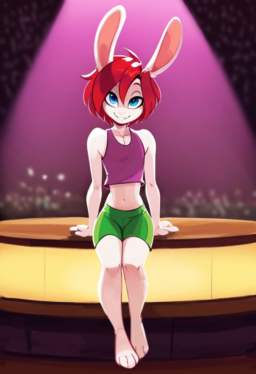 furry, anthro, anthropomorphic, white fur, white rabbit, rabbit, bunny, rabbit ears, bunny ears, rabbit tail, bunny tail, male, femboy, twink boy, paws, blue eyes, green shorts, purple tank top, small body, lithe, thin, skinny, redhead, red hair, short hair, big eyes, cute, cartoon style, solo, smile, midriff, sexy, good anatomy, high quality, best quality, background, nsfw, lewd, bold lines, flat shading, flat lighting, vibrant colors, little body, full body shot, whole body, full body, club, nightclub, flirtatious, flirt, bedroom eyes,