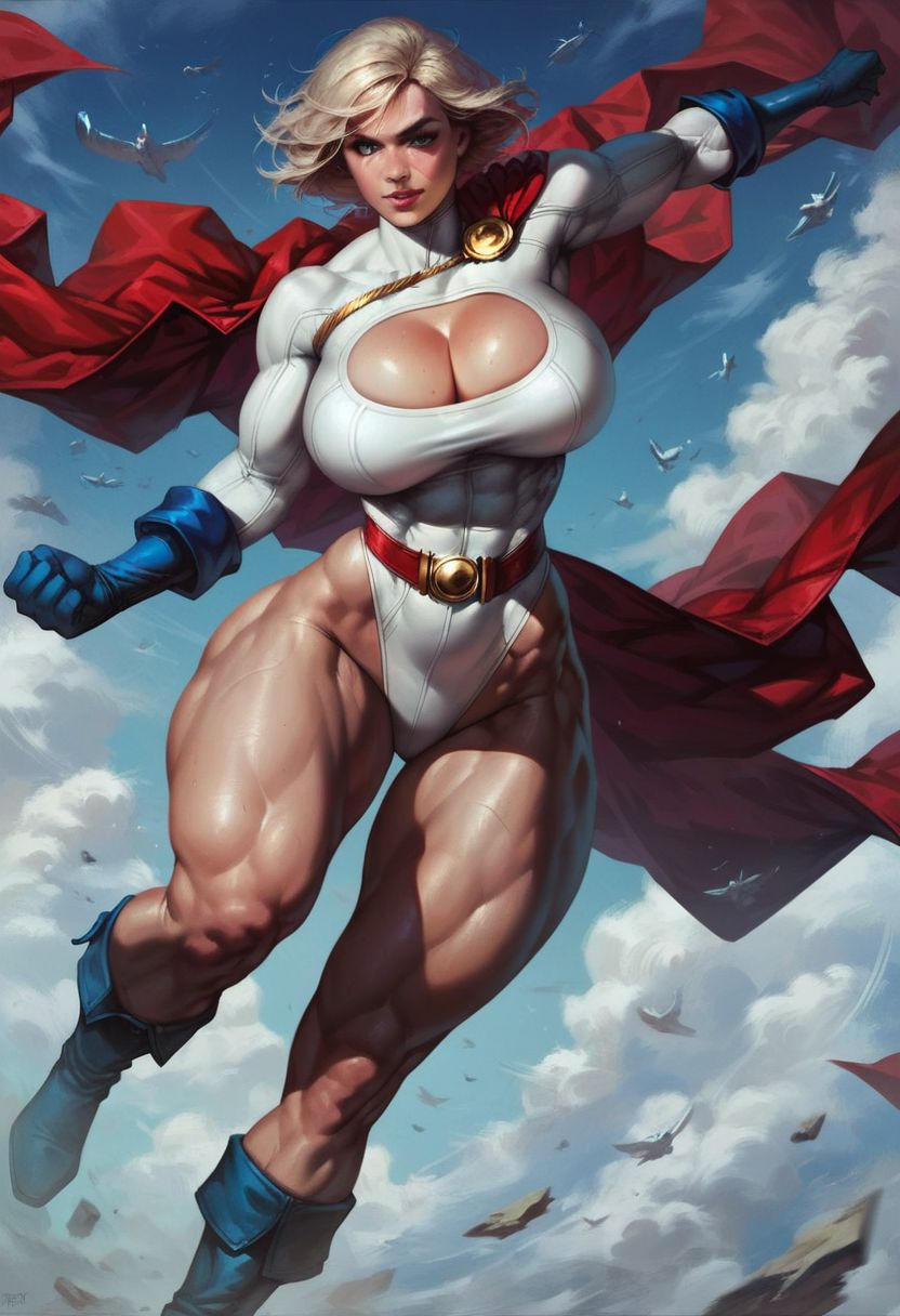 score_9, score_8_up, score_7_up, score_6_up, score_5_up, score_4_up, power girl flying, sky background, huge breasts, cleavage cutout, cleavage ,ensure perfect human anatomy, wide torso, wide hips, muscular glutes, large glutes, muscular quads, prominent thigh muscles , glute muscles, goddess, thick thighs, wide hips, extremely vascular,realistic skin texture
