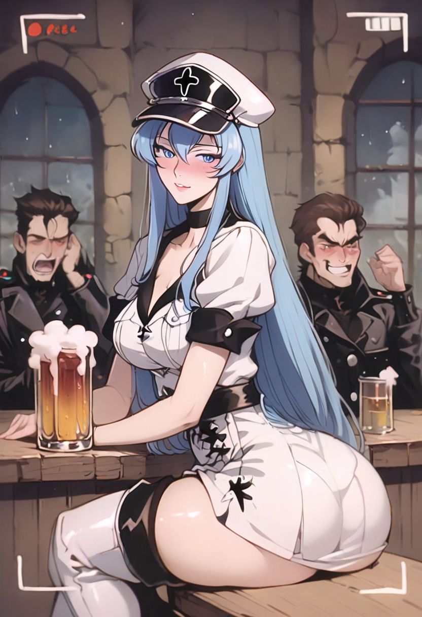 score_9, score_8_up, score_7_up, score_6_up, score_5_up, score_4_up, official art, 1990s \(style\), vintage, <lora:OldAnimeStyle_XL_v3:.8>, <lora:Anime Style 2 SDXL_LoRA_Pony Diffusion V6 XL:.7>, source_anime, 1girl, blush, surprised, 1 boys , on hand (celular, recording butt) paparazzi, drunk, esdeath, blue eyes, blue hair, long hair, grin, BREAK boots, choker, cleavage, collarbone, hat, ice, military, military uniform, peaked cap, thigh boots, thighhighs, uniform, big breast, huge butt, inside bar, bar, potions, red beer on the back, raining, back view, sit on the table, 1boy (1 hand skirt_lift:1.1),drinking red ale, working waitress, many men cheering hino rei