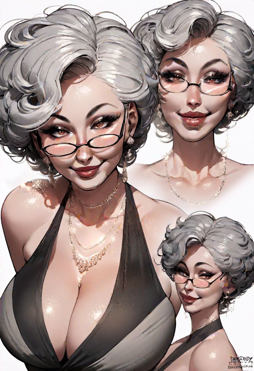 score_9, score_8_up, score_7_up, score_6_up, score_5_up, source_anime, (masterpiece)), ((best quality)), (ultra-detailed), looking at viewer, solo, close-up, seductive smile, 1girl, looking at viewer, solo, close-up, seductive smile, wide hips, curvy, venus body, face focus, grey hair, short hair, curly hair, wide hips, curvy, lip Best Quality, front view, glasses, thin white frame, wrinkle skin, wrinkle, Gilf, old, (mature female, older,) sexy, conceptart,multiple views,white background,simple background