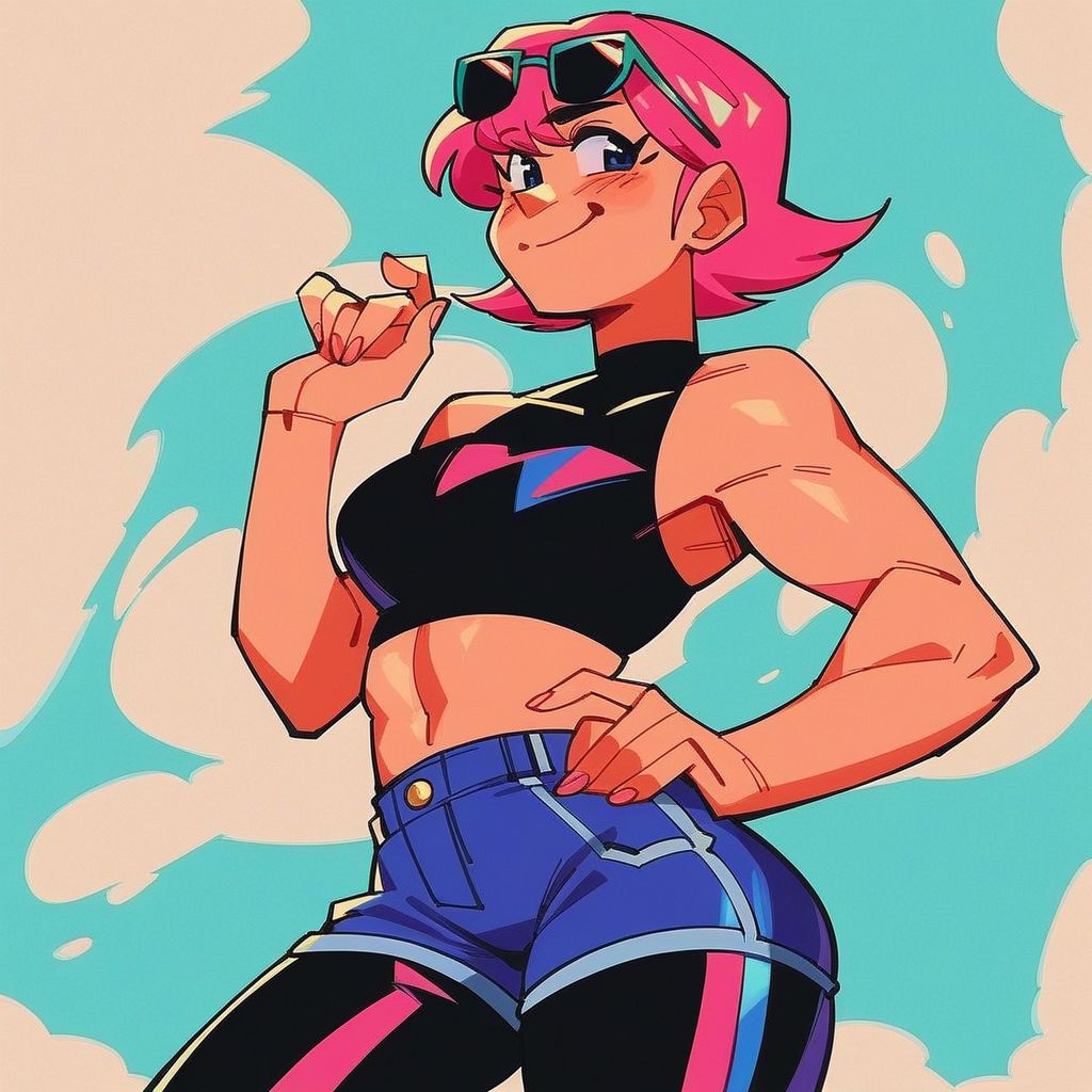 score_9,score_8_up,score_7_up,score_6_up,score_5_up,score_4_up, solo, retro, anime, 90's, smile, hand up, crop top, bodysuit, bodysuit under clothing, shorts, sunglasses, eyewear on head, shiny hair, pink hair, hair intakes