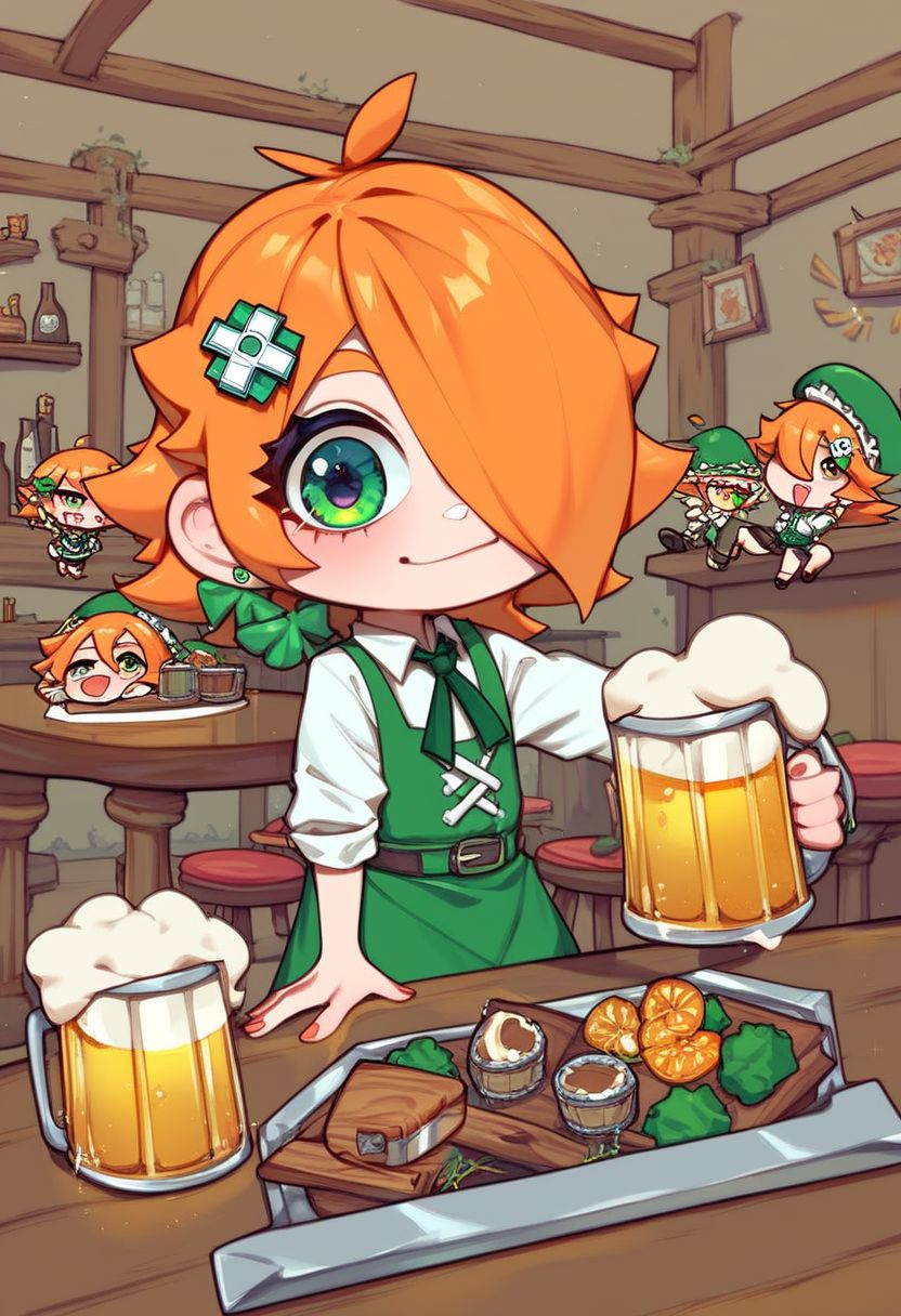 score_9, score_8_up , 1girl, long orange hair, hair over one eye, Irish barmaid, green barmaid, bodice with criss-cross laces, collared shirt, shamrock hair ornament, serving beer mugs, tavern, tables, chibi, big head, kawaii, solo