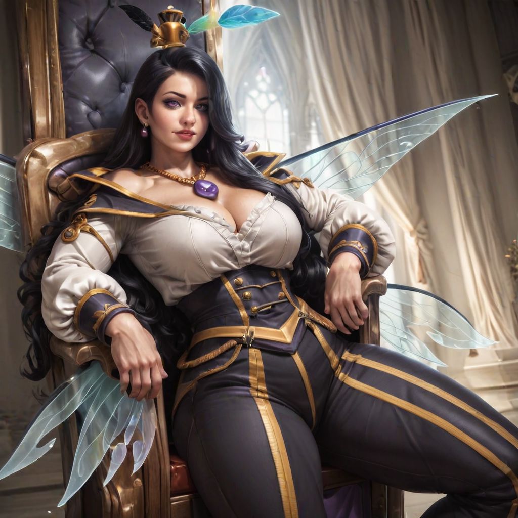 Action scene, Photo realistic, score_9, rating_safe, solo (arch fey woman, (beautiful detailed face), (violet eyes), ((gold skin ral-chrome)), (pirate outfit, white blouse, black pants), (fairy wings), (highly detailed flowing black hair), (thick thighs, large muscles), (two sheathed swords)), standing next to a throne, in a detailed throne room