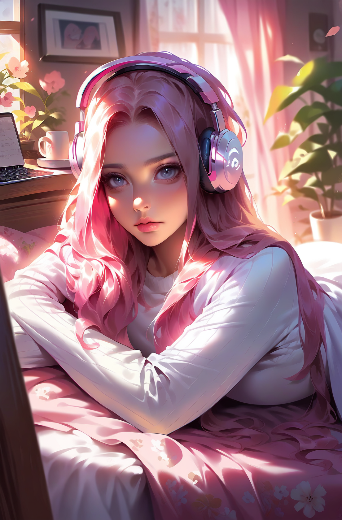 score_9,score_8_up,score_7_up,score_6_up,score_5_up,score_4_up rating_suggestive, 1girl,solo,long hair,looking at viewer,bangs,blue eyes,skirt,shirt,long sleeves,closed mouth,white shirt,pink hair,flower,lying,day,artist name,indoors,sweater,cup,lips,parted bangs,pillow,grey eyes,book,eyelashes,window,bed,makeup,depth of field,headphones,leaf,on bed,expressionless,phone,floral print,crossed arms,table,sunlight,plant,on stomach,lipstick,curtains,desk,mug,pink lips,realistic,nose,blanket,clock,red lips,potted plant,lamp,white sweater,computer,bedroom,cushion,laptop,picture frame,coffee mug,flower pot,desk lamp,lipgloss,print mug <lora:xl_kelala_pony_ceshi(pony):1>