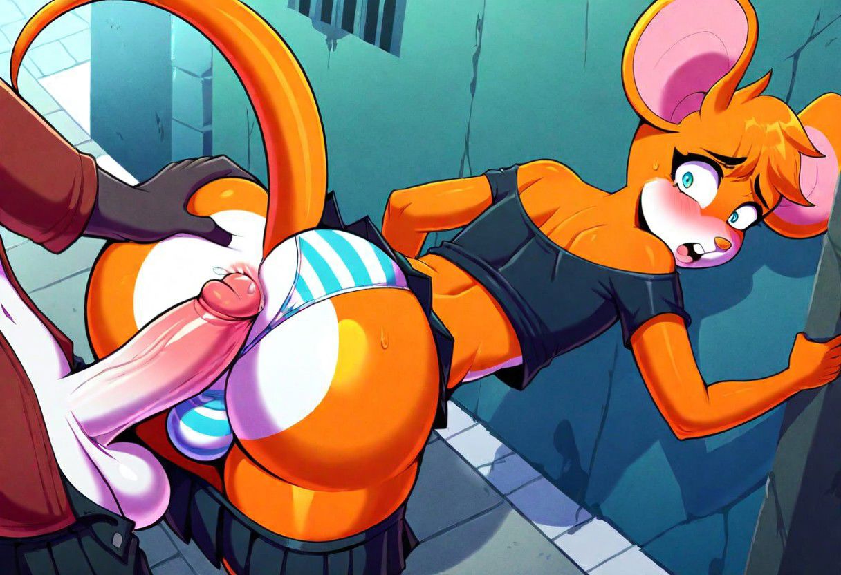 score 7 up, score 8 up, good quality, high quality, highest quality, high res, absurd res, rating_explicit, anthro, man, 2men, femboy focus, girly, pleated full skirt, black striped panties, bulge, panty bulge, balls, big balls, penis, gay, mouse, mouse tail, mouse ears, precum, hand on penis, alleyway, cornered, embarassed, scared, worried, exhibitionism, 1femboy, bully, alley corner, dead end alley, hiding, midriff, undressing, taking off clothes, orange fur, butt, big ass, taking panties off, anus, backsack, sex, anal, male/male, girly/girly, forced, male penetrated, penetrated, ejaculating while penetrated, from behind, doggystyle, anal sex, grabbing ass