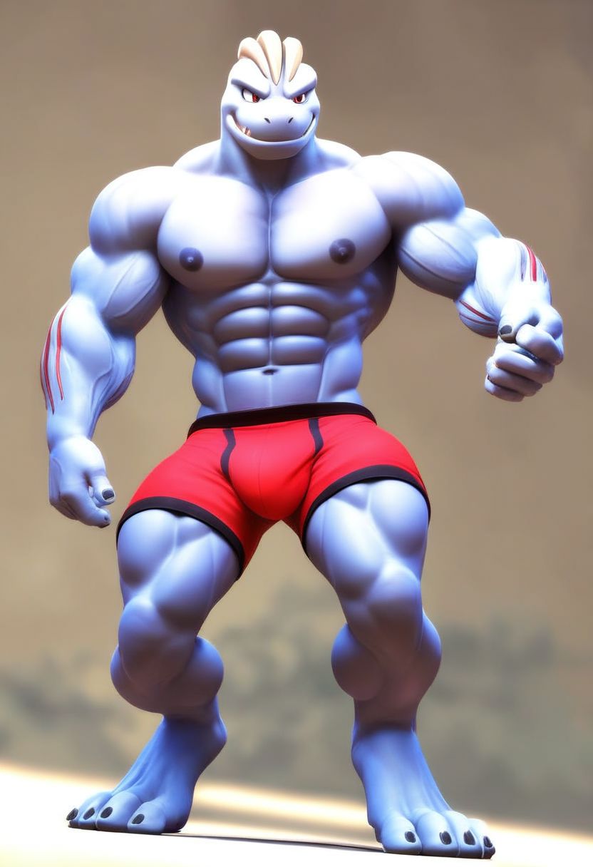 score_9, score_8_up, score_7_up, score_6_up, score_5_up, score_4_up, source_furry, rating_questionable, topless, shirtless, shorts, digitigrade, anthro, machoke, barazoku, bara, muscular male, big pecs, abs, nipples, jock, frat bro, hunk, school athlete, bulge, fighting stance, confident, smile, good anatomy, full-body portrait, detailed, ultrarealistic lineless 3d style, 3d painted style, (shading:0.8), soft lighting, complex background, by null-ghost, by connivingrat, by twitchyanimation, by kraaisha
