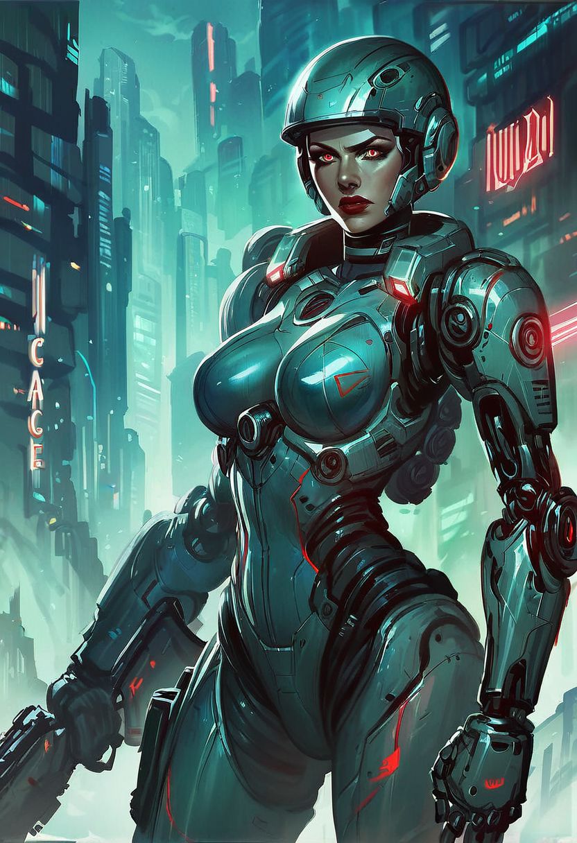 score_9, score_8_up, score_7_up, black choker, sketch, themed_sequential_art, female character, detailed face, beautiful , red lips, eye lashes, determined expression, futuristic helmet, cybernetic body, advanced suit, confident posture, holstered weapon, glowing energy weapon, cityscape background, neon lights, official art, anime style