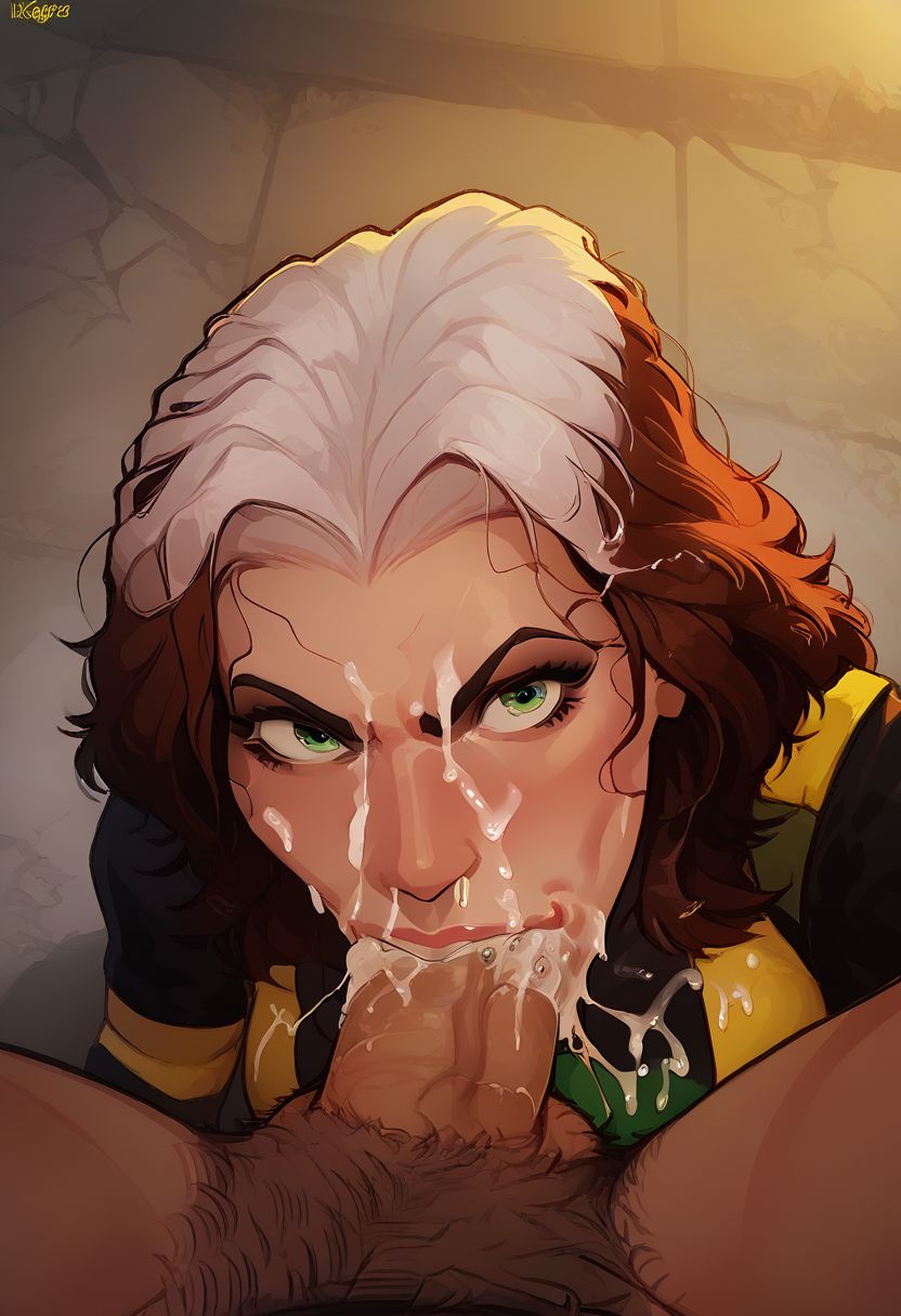 score_9, score_8_up, score_8, rating_explicit, source_anime, rogue_(x-men), marvel, 1girl, brown_hair, green_eyes, big penis, angry dragon, fellatio, cum flowing from nose, cum on lips, cum on chin, deepthroat, throat bulge, broken chocker, smug face, smiling, looking at viewer, slutty, wet, horny