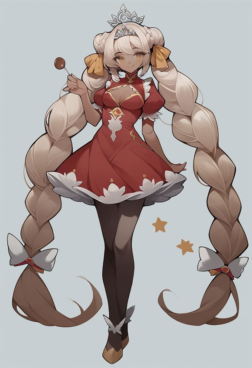score_9, score_8_up, score_7_up, <lora:Smooth Style LoRA XL:0.4>, zPDXL, 1girl, long hair, solo, twintails, dress, cleavage cutout, very long hair, dark skin, puffy sleeves, blonde hair, dark-skinned female, holding spoon, food, short sleeves, full body, crown, puffy short sleeves, standing, looking at viewer, yellow eyes, white hair, food-themed clothes, closed mouth, short dress, red dress, oversized object, pantyhose, medium breasts, smile, brown eyes, tiara, braid, hand up, hair ornament