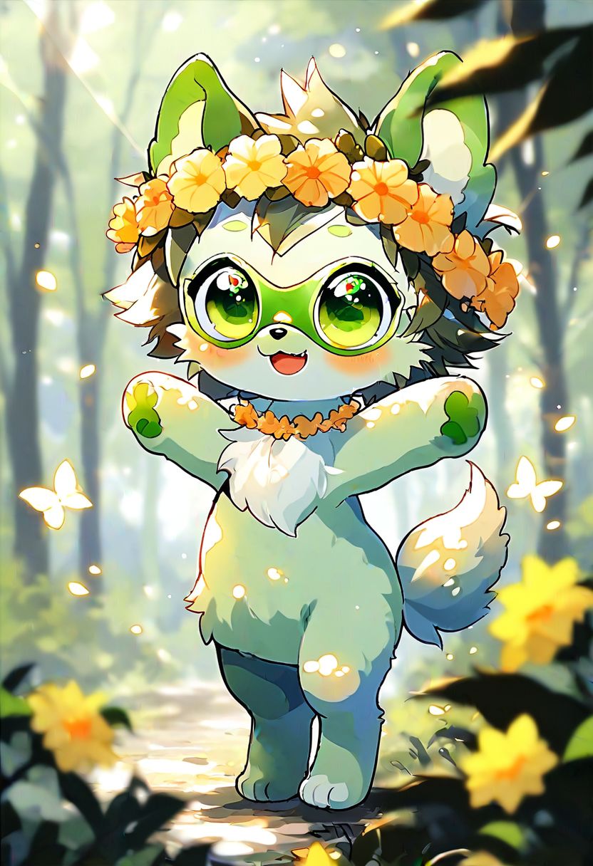 (((detailed eyes, detailed face))), (cute feral, quadruped, Peridot is a Papillon dog with a yellow body, white chest fluff and ear tufts and green ears and tail. Her Jewel Eyes are made out of green peridots. For her attire, she wears a green and yellow butterfly-shaped hair clip by her left ear and a green and yellow flower garland around her neck. no human), standing, arms up, smile, (konzaburou, ukan_muri), forest, light environment, soft shading, 8k, UHD, masterpiece, tail,