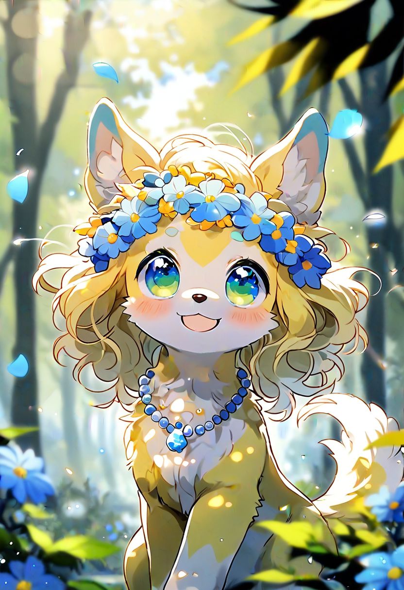 (((detailed eyes, detailed face))), (cute feral, quadruped, Sapphie is a Cavalier King Charles Spaniel dog with lemon yellow fur and cornflower blue ears. Her Jewel Eyes are made out of blue sapphires. For her attire, she wears a light pink and light blue flower garland on her head and a white pearl necklace with a blue treble clef note-shaped sapphire jewel attached around her neck. no human), standing, arms up, smile, (konzaburou, ukan_muri), forest, light environment, soft shading, 8k, UHD, masterpiece, tail,