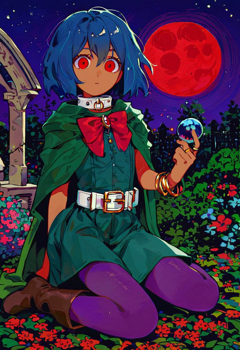 score_9, score_8_up, score_7_up, rating_safe, <lora:Smooth Anime Style LoRA XL:1>, illustration, fully colored, high resolution, anime style, Castlevania style, pulp art style, cute, kawaii, (((girl posing))), 1girl, solo, tanned-skin, petite, skinny, flat chest, dark-blue hair, bob cut, messy hair, red eyes, emerald cloak, red bow, white collar, collar up, aqua-green dress, knot belt, dark-purple pantyhose, gold ring bracelets, brown boots, outdoors, cemetery, garden, night, red moon.