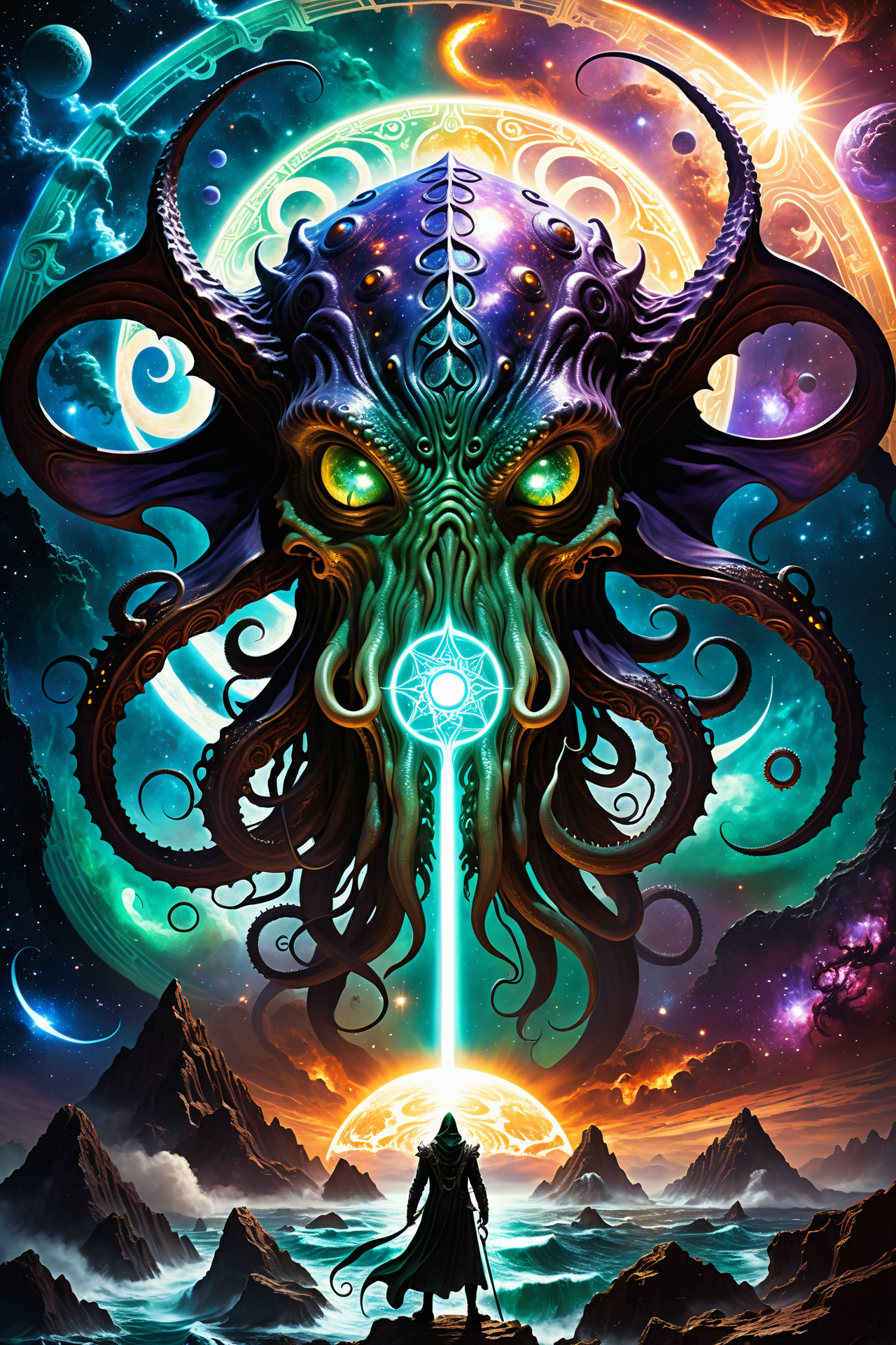 art inspired by the novels of H p lovecraft, Ancient space horror , Cthulhu eldritch horror consumes the sun, thousands of the last fighters and star ships of humanity attempt to stop it , high definition , 8k , space , milky way background partially obscured, mind flayer, illithid , demons from the abyss , deep space , solar battle , end of times , Ragnarok <lora:more_details:0.3>detailed expressive eyes, fantasy style, dramatic sky, <lora:xl_more_art-full_v1:0.4> <lora:Fantasy_art_XL_V1:0.1>