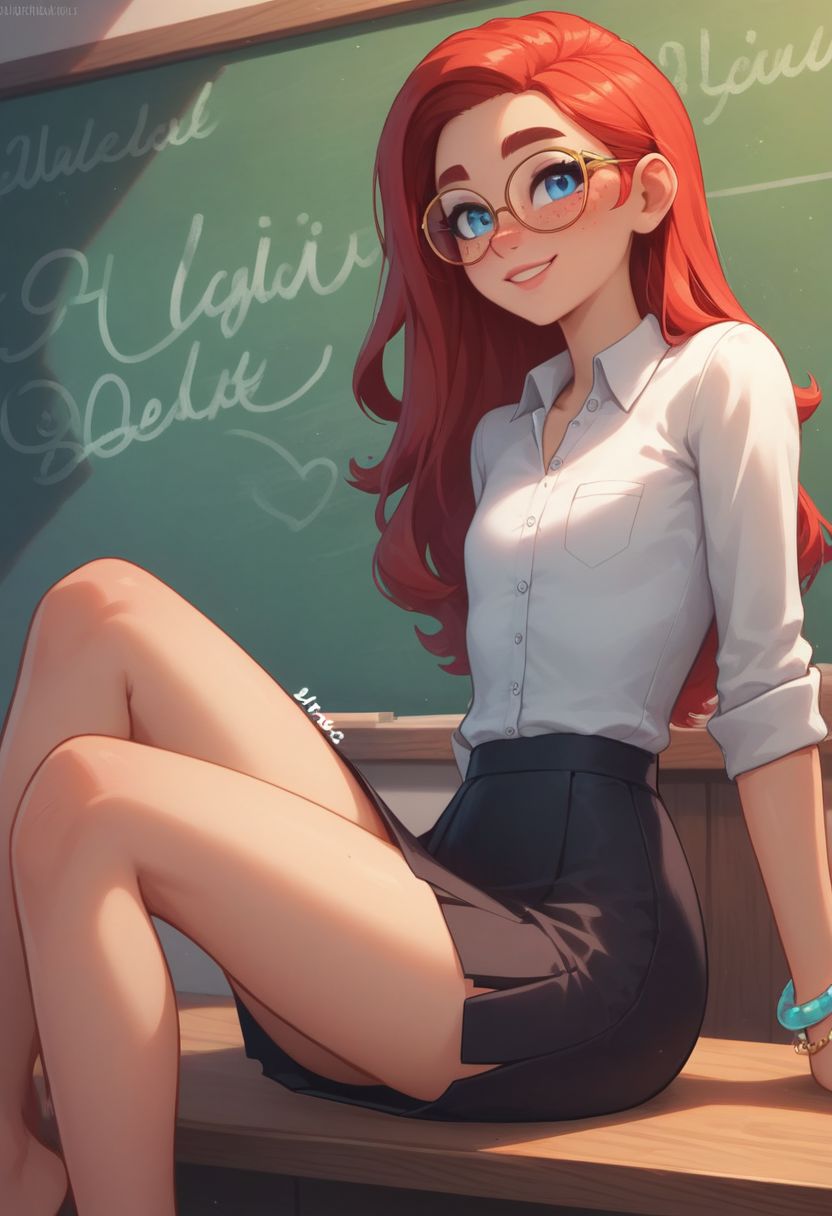 score_9, score_8_up, score_8, volumetric lighting, vibrant colors,. 1 girl , ((skinny)), teacher , 18 years old, long hair, (((cute face))), red hair, bunch of hair, detailed face, blue eyes, glasses, pearls, bracelet, thick eyebrows, blush, freckles, white shirt, black mini skirt, flat chest, long legs, (((sound effects))), lips, smile, slim waist, wide hips, fun, lines of movement, ((blackboard background)),