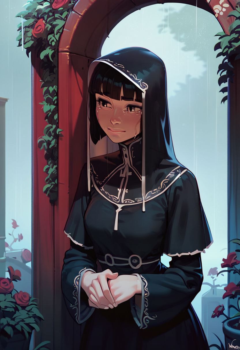 score_9, score_8_up, score_8, score_7_up, score_7, score_6_up, score_6, score_5_up, Score_5, 1girl, (cute face:1.4), hime cut, low twin-tails, (young:1.1), black dress, funeral, veil, tears, grave yard, rain