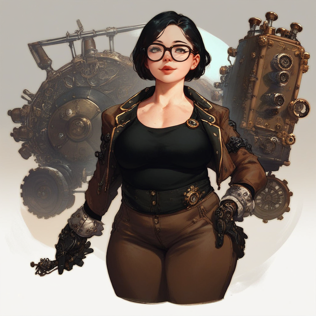 score_9. score_8_up. score_7_up. score_6_up. score_5_up, solo, short black hair, glasses, muscled chest, chubby, woman, female, standing, artificer, steampunk coat, black shirt, steampunk robot, workshop