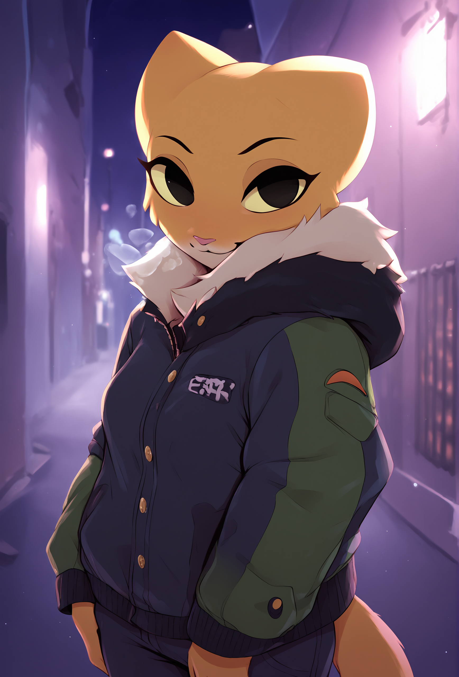 score_9, score_8_up, score_7_up, score_6_up, score_5_up, score_4_up, alley, bokeh, depth of field, night, city lights <lora:pudgeruffian_style_ponyXL_v1:1> pudgeruffianstyle BREAK <lora:katia_managan_ponyXL_v1.2:1> 1girl, katia managan, furry, cat girl, black eyes, solid circle pupils, eye reflection, fur trim, jacket, light smile, breath