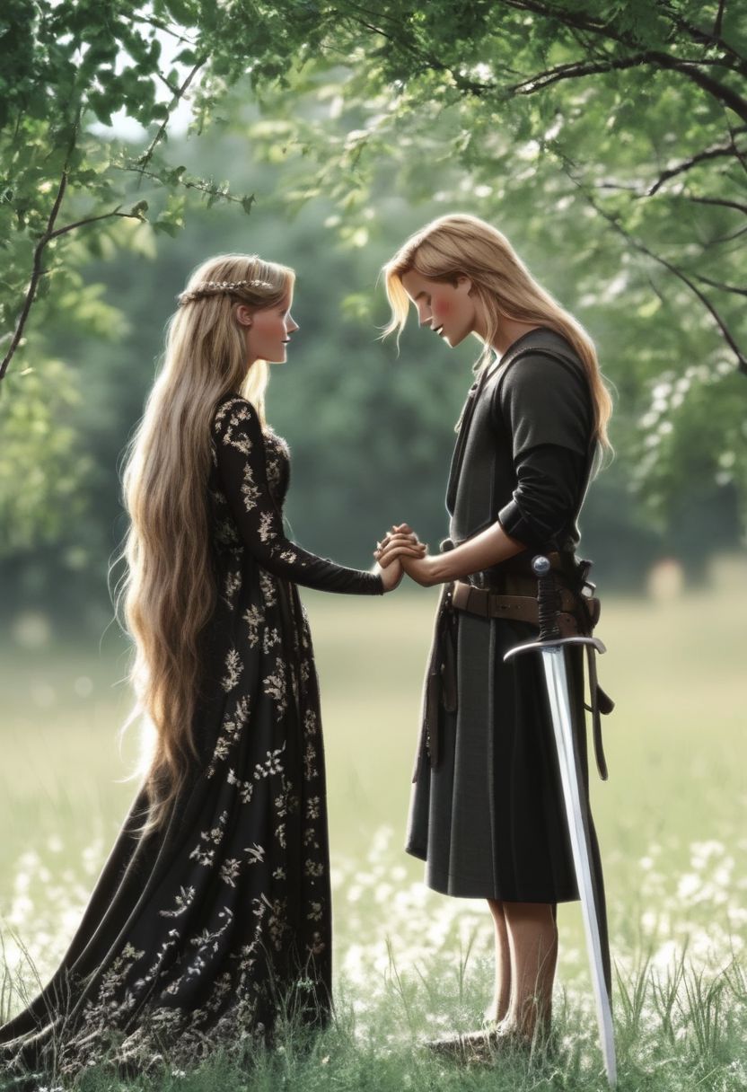 score_9, bybm style, romance, film still, grainy, , 1girl, 1boy templar, sword on belt, dress, black dress, long hair, blonde hair, outdoors, blurry, holding hands, grass