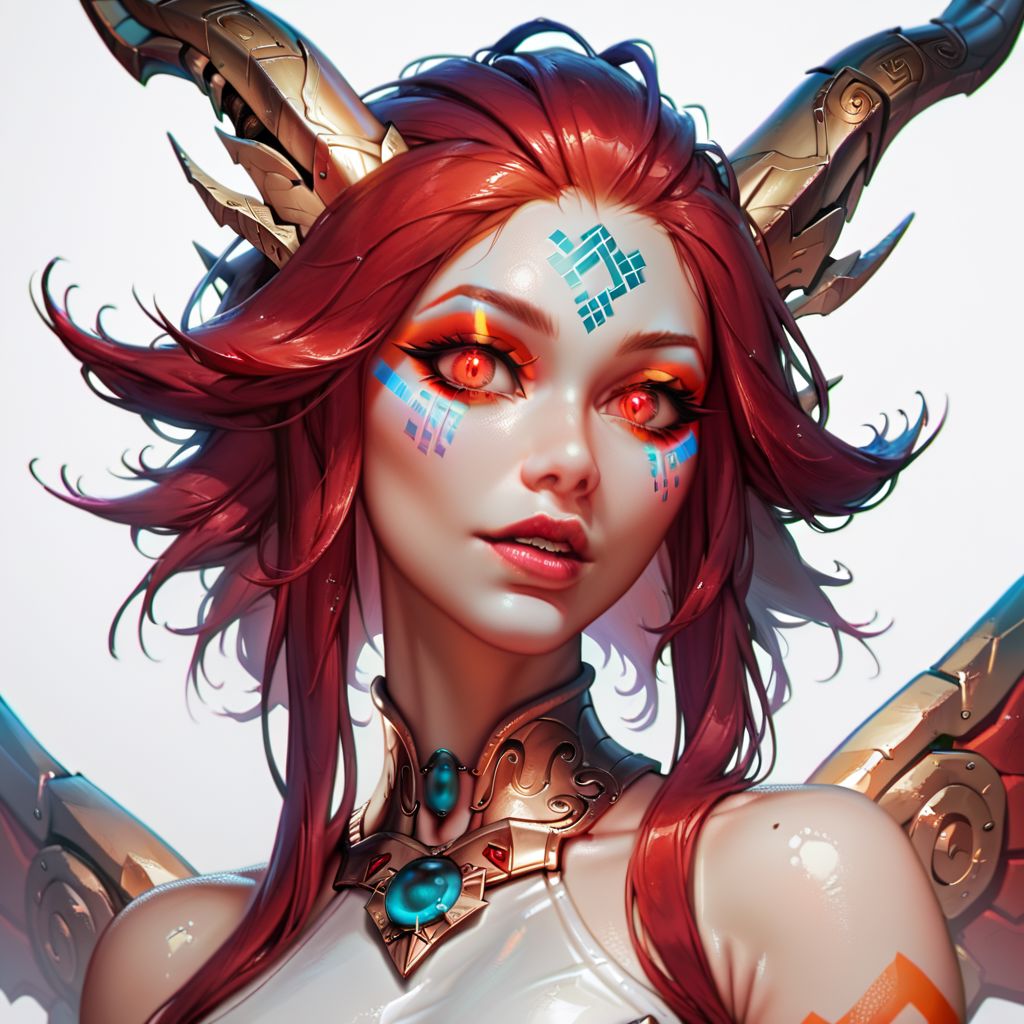 score_9, score_8_up, score_7_up, score_6_up, source_cartoon, 1girl, portrait face, (close up:1.4), white background, dragon girl, metallic skin, bronze skin, orange skin, shiny skin, glitter, bronze metallic wings, long lion tail, red hair, r3pt1l3, tribal geometric tribal tattoos, scales for skin, glowing red eyes, metal pauldrons, metal horns