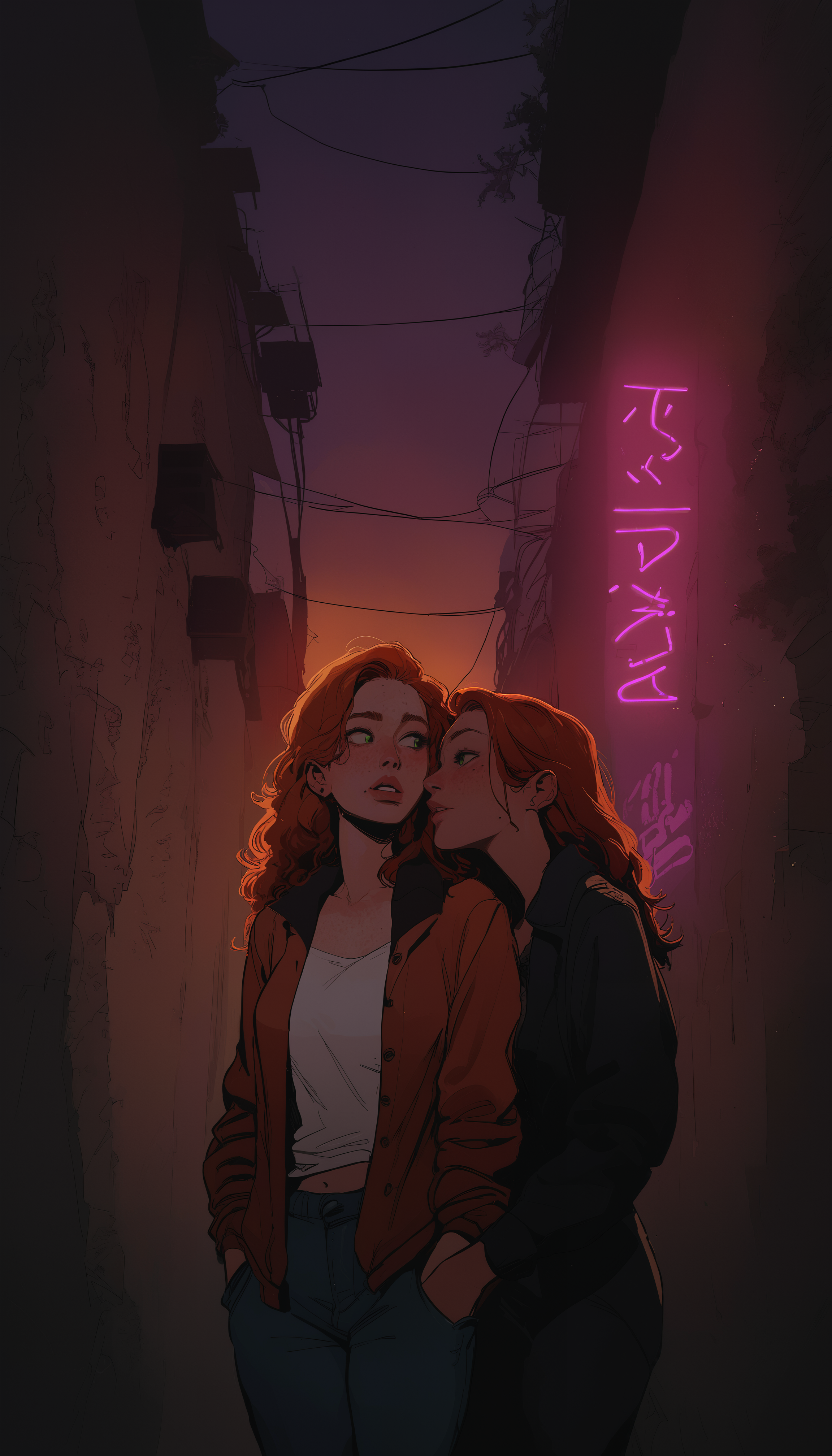 score_9, score_8_up, score_7_up, 2girls, ((yuri)), 20 years old , cute, freckles , beauty mark , medium breasts, sidelocks, (green eyes), redhead , straight hair, oversized jacket ,alley , (neon, vibrant), purple ,red , sunset, golden hour lighting <lora:D4rC0mXLP:1> D4rC0m <lora:sinfully_stylish_SDKL:0.8> <lora:incase_v14:0.8>