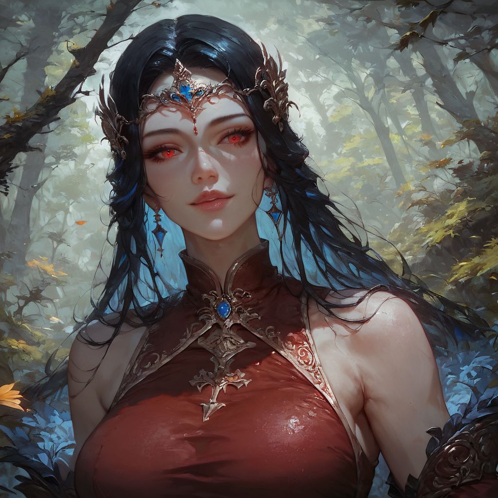 score_9, score_8_up, score_7_up, 1girl, beautiful face, long black hair with blue highlights, seductive smile, detailed face, large breasts, beautiful red eyes, fantasy theme, dhampir girl, solo, scarlet red chinese dress, blue circlet, walking in forest