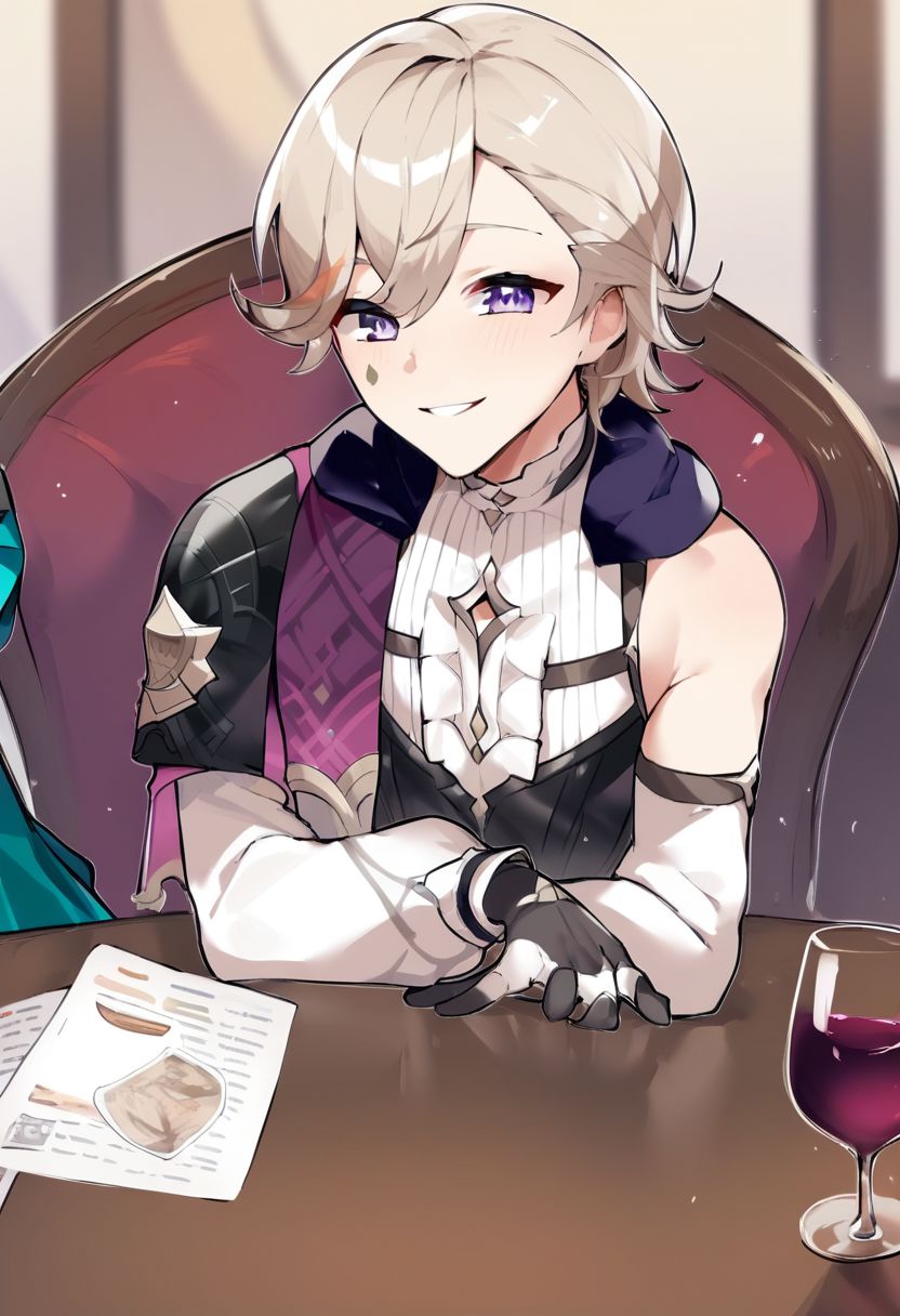 score_9, score_8_up, score_7_up, score_6_up, score_5_up, score_4_up, source_anime, BREAK, 1boy, lyney_\(genshin_impact\), male_focus, teardrop_facial_mark, black_gloves, detached_sleeves, white_shirt, sitting, table, chair, smile, pov, resturant, romantic, purple eyes, food, wine,