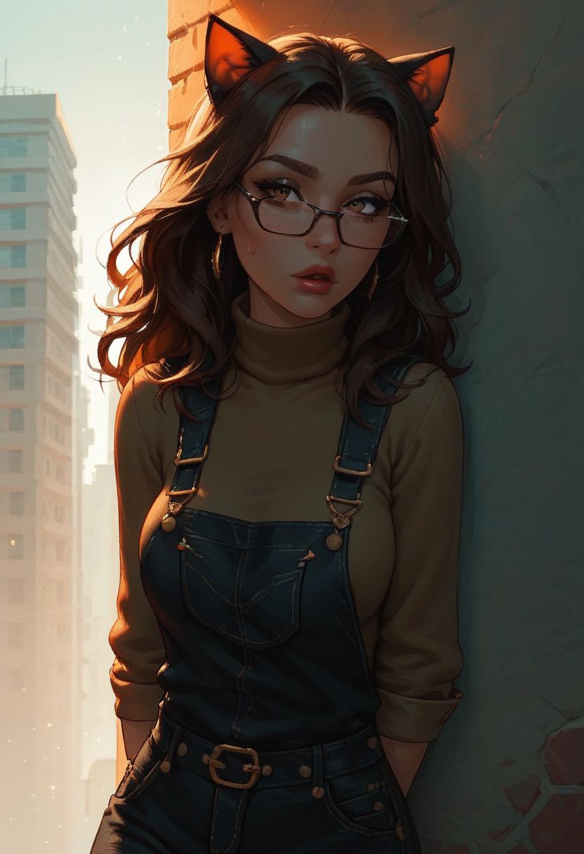 score_9, score_8_up, scoup, godrays,, sunlight hitting face, lit from front, sunset sky, city skyline in the background, g0thicPXL, GTA, a cocky confident stunningly beautiful woman, glasses, long brown hair, brown eyes, cat ears, yellow turtleneck, black overalls, perfect skin, portrait, boots, sweating, summer heat, heat effects, sun rays, sharp outlining, high contrast, vibrant colors,BREAK, against wall, summer