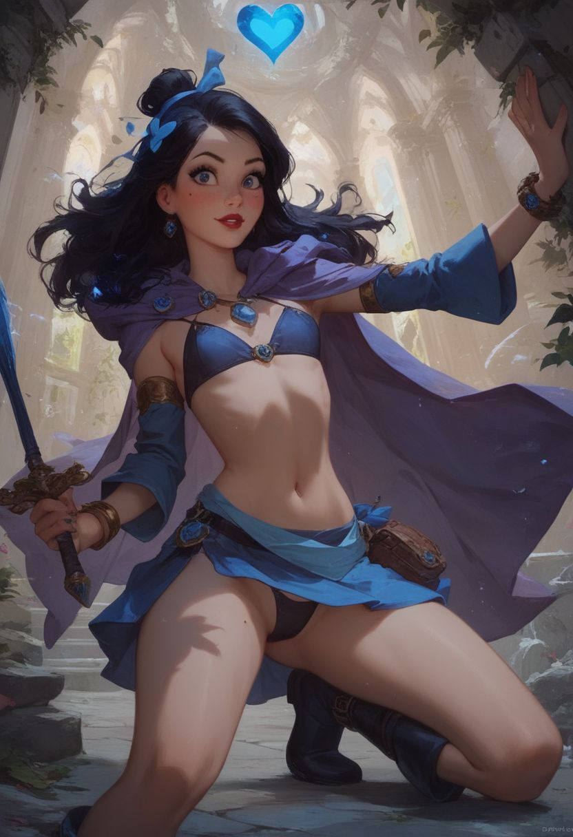 score_9, score_8_up, score_7_up, score_9, score_8_up, score_7_up, pinup girl pose, Expressiveh, a sexy girl, cute sexy pose, dynamic pose, pinup pose, big round eyes, disney eyes, FEATURES: ((glowing blue streaks in hair)) blush, bright red lipstick, small breasts, long legs, black hair, in messup updo, bangs framing face, freckles, beauty mark, big smile on face, looking at viewer CLOTHES: She wears a short, lace-up leather bodice with a flowing, asymmetrical skirt that ends mid-thigh. She pairs it with knee-high suede boots and a fur-lined cloak. Around her neck is a leather cord necklace with a blue time travel device, skimpy girly clothes, showing lots of skin, Prop: BACKGROUND: She stands in a grand castle courtyard with knights practicing sword fighting, a stone fountain, ivy-covered walls, and banners fluttering in the wind. SEX: Floating neon hearts, semi realistic