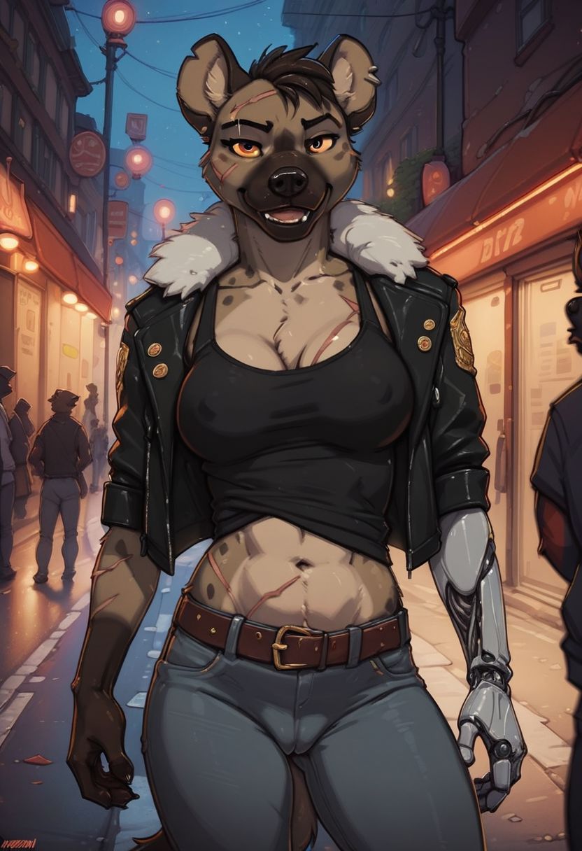 score_9, score_8_up, score_7_up, score_6_up, score_5_up, score_4_up, best quality, highly detailed, intricate details, extremely detailed, perfect hands, 5 fingers, smooth lines, (furry art, uploaded on e621:1.1), zaush style art, random fur color, dog, hyena female, petite body, large breasts, solo, prosthetic arm, prosthetic leg, scars on body, scar on face, gray fur, black tank top, pants, jacket, fur trim, belt, belt buckle, camel toe, on street, at night, lifting shirt, leaning foreword,