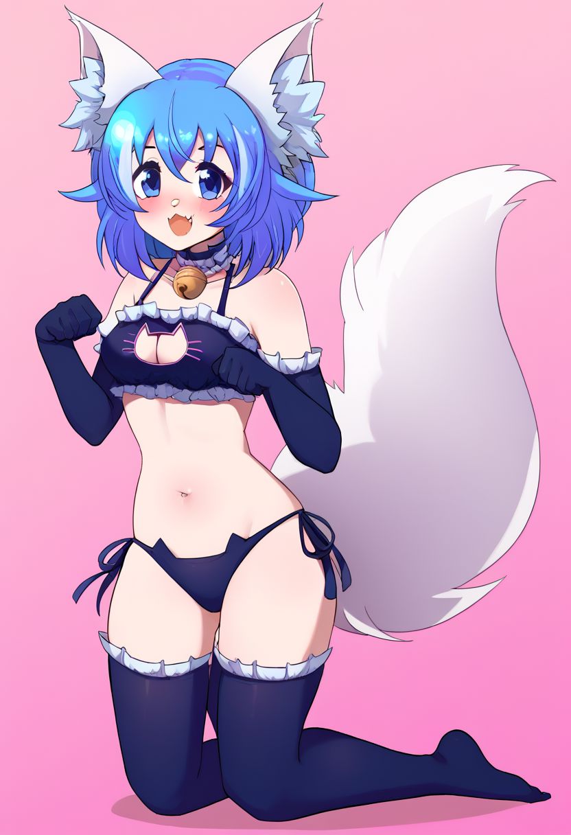 <lora:Wolfychu:0.7>, Wolfychu, blue eyes, (((blue hair))) (masterpiece, best quality, high quality, highres, ultra-detailed), animal ears, (bangs), animal ear fluff, wolf girl, (white wolf tail), (white wolf ears), highly detailed, ((medium breast)), HD, furry, short hair, blue shoulder length hair, average build, ((Wolfychu)), fang, virtual youtuber, (((1 girl, solo, 1girl))), score_9, score_8_up, score_7_up,1girl, solo female, epic photography, extremely detailed, high quality, absurd res, high res, fang, cat_lingerie, underwear, tail, meme_attire, cleavage_cutout, panties, side-tie_panties, cat_cutout, thighhighs, blush, gloves, underwear_only, bra, cat_ear_panties, elbow_gloves, frills, white_legwear, looking_at_viewer, breasts, pink_background, full_body, white_bra, ribbon, standing, collar with bell,