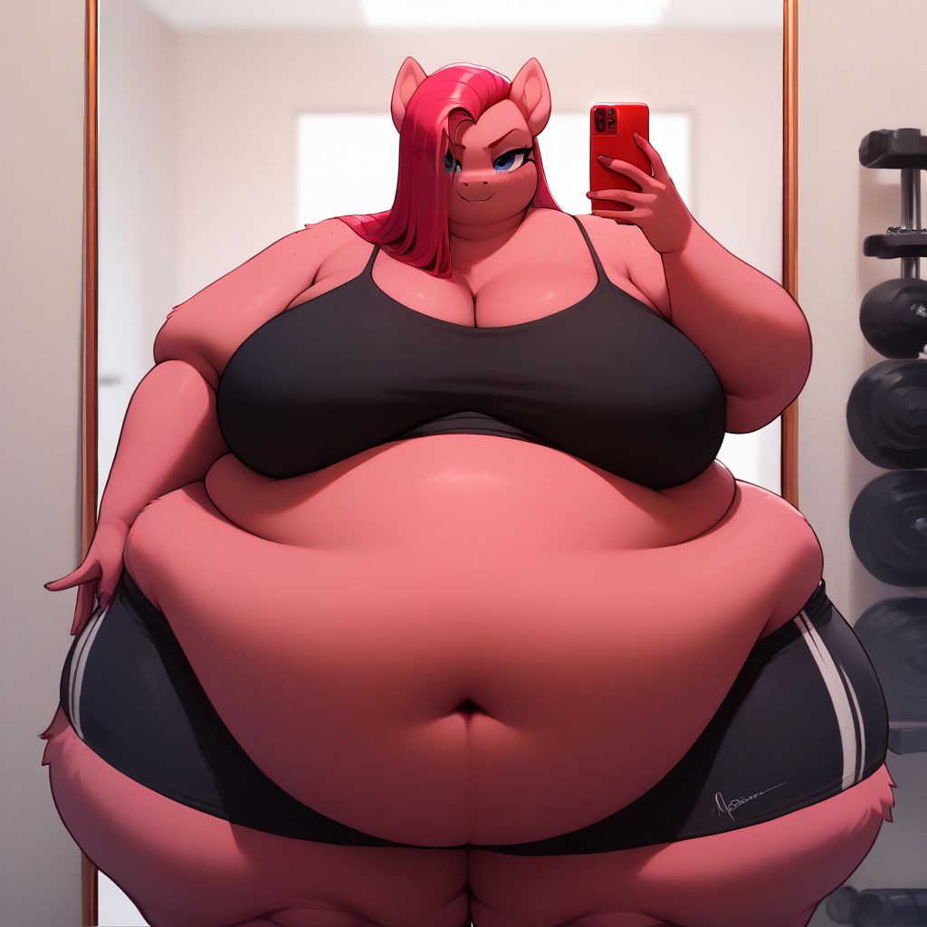 (masterpiece, best quality, absurdres, high detail), (lowering pants), (mirror selfie), ((red phone)), (score_9,score_8_up,score_7_up,score_6_up), solo, 1girl, anthro pony girl,source_cartoon, ((pony)) source_furry, official,(freckles, fluffy fur), hyper heavy breasts, sexy pose, from front, black string camisole, black panties, black boyshorts, slight smirk, looking at viewer, in gym, mirror, looking in mirror, (huge belly, double chin, huge thighs, morbidly obese:1.2), Pinkamena Diane Pie