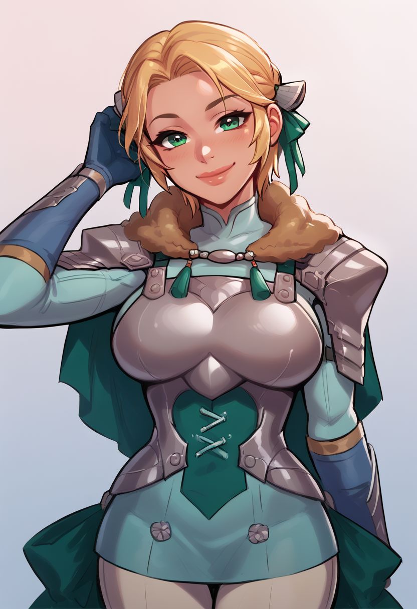 score_9, score_8_up, score_7_up, score_6_up, score_5_up, score_4_up, warIngrid, hand up, young face, waringrid, short hair, hair ribbons, shoulder armor, armor, breastplate, underbust, green coat, fur trim, vambraces, blue gloves, green cape, green skirt, white pants, curvy, turning to face viewer, head tilt, 1 girl, large breasts, cute smile, raised eyebrow, confident, mocking smile, looking at viewer, kinky, haugthy, hourglass figure, front view, looking at viewer, round face, 25 years old, cutest girl in the world, sweet expression, simple background, gradient background