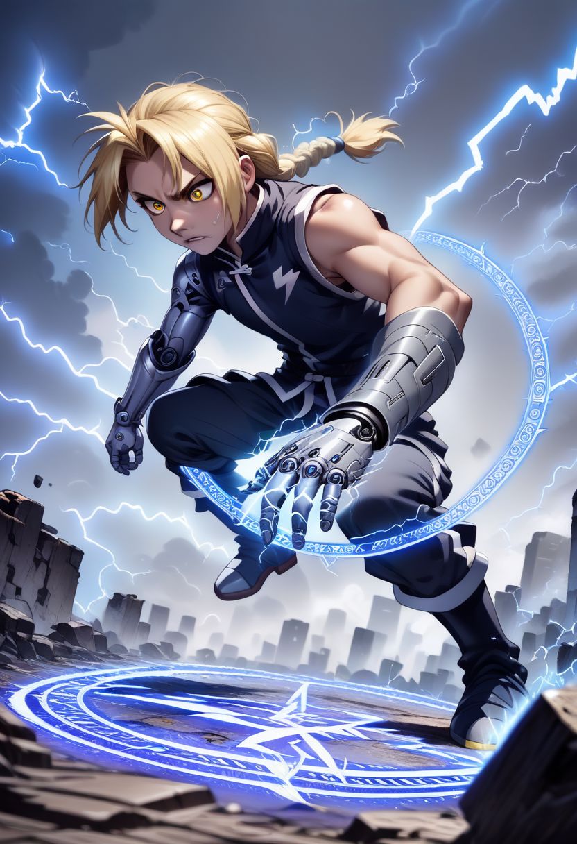score_9, score_8, score_7, score_6,rating_safe, source_anime,edward_elric, blonde hair, yellow eyes, braid, single braid, braided ponytail, single mechanical arm,(push-ups),(light blue) magic circle on ground,(light blue) magic circle around hands,(lightning effect,thunder effect around hands,lightning effect in magic circle:1.2),speed line,motion blur,emphasis lines,(earthquake in background,rubble on air:1.2),thunder,dust cloud,(perspective,side view,wide angle:1.2),(intricate_details_xl:1.5)