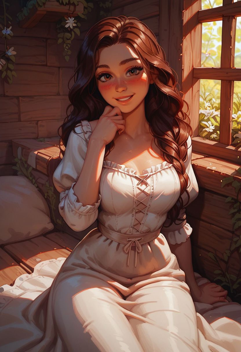 (score_9, score_8_up, score_7_up), girl, (beautiful face, cute face, 18 years old), brunette hair, long hair, straight hair, medieval dress, narrow hips, inside cozy medieval cabin, soft lighting, smiling, blush, looking at viewer