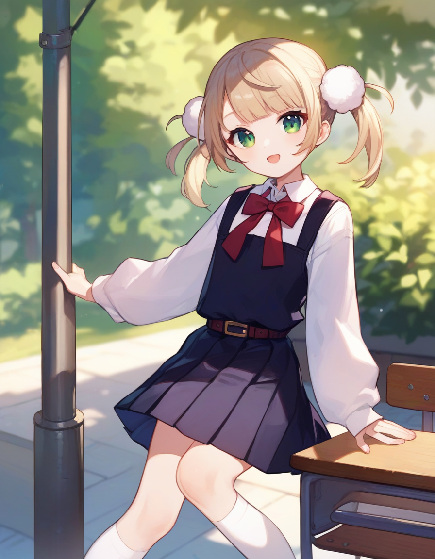 score_9,score_8_up,score_7_up,score_6_up BREAK official art,solo,outdoors,upper body,(portrait:1.5),looking at viewer,facing viewer,aged down,child,shigure ui (vtuber),short hair,light brown hair,twintails,pom pom hair ornament,hair intakes,green eyes,school uniform,bangs,red bow,collared shirt,white shirt,long sleeves,belt,black dress,sleeveless dress,pleated dress,pinafore dress,flat chest,kneehighs,white socks,black footwear,uwabaki,<lora:Shigure Ui(vtuber)-Pony:1.4>,<lora:Smooth Anime Style LoRA XL:0.8>,