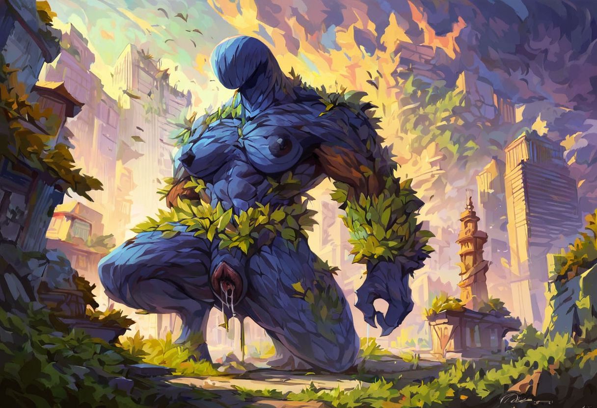 ASCII score_9, score_8_up, score_7_up, score_6_up, score_5_up, score_4_up, digital painting, Fantasy, city, living building, animate inanimate, sentient structure, urban city, carts, high detail, rocks, A park where the trees are shaped like women with functioning genitalia, 1girl, Ent, living tree, wood texture, colored bark, colored foliage, (faceless), big lips, Eyeless, no nose, dark nipples, big breasts, big ass, monster, textured skin, giant pussy, dripping pussy,