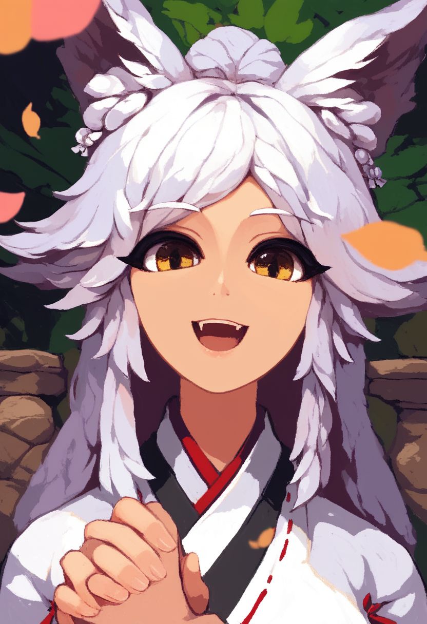 ((score_9), score_8_up, score_7_up), score_6_up, score_4_up, score_5_up, artful dreamy masterpiece,solo, Non-Human Character Design with Personality: A character design that portrays a non-human creature,,(beautiful face),big bright golden eyes,mischievous kitsune,small fangs,fluffy fox ears with a unique and expressive form that conveys personality and depth,mean smile,white hair,silk smooth long hair,mischief expression,hand grabbing viewer hand,open mouth,(face focus),fox miko jewelry,close up,stone bridge with falling cherry blossom leaves theme,japanese shrine background,