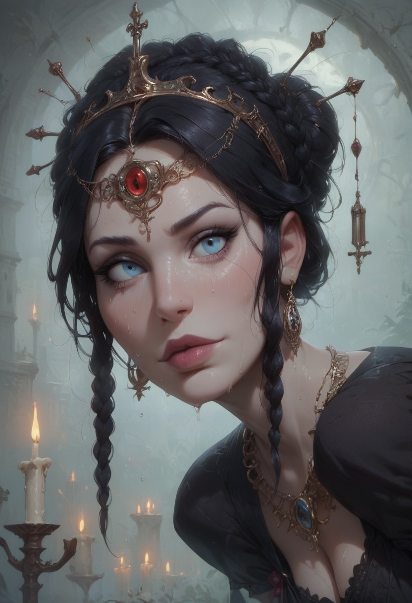 score_9, score_8_up, score_7_up, score_6_up, score_5_up, score_4_up, 1girl, adult, Enigmatic gothic beauty, black lace dress, detailed headpiece, candlelit surroundings, ancient pillars and arches, dramatic lighting on face, jeweled necklace, intense stare , big butt, booty, bubble butt, emphasis on her ass, huge ass, seductive, slutty, butt slut, steam, sweat, , bent over